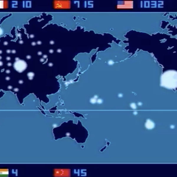 "2053" - This is the number of nuclear explosions conducted in various parts of the globe. "This piece of work is a bird's eye view of the history by scaling down a month length of time into one second. No letter is used for equal messaging to all viewers without language barrier. The blinking light, sound and the numbers on the world map show when, where and how many experiments each country have conducted. I created this work for the means of an interface to the people who are yet to know of the extremely grave, but present problem of the world."
