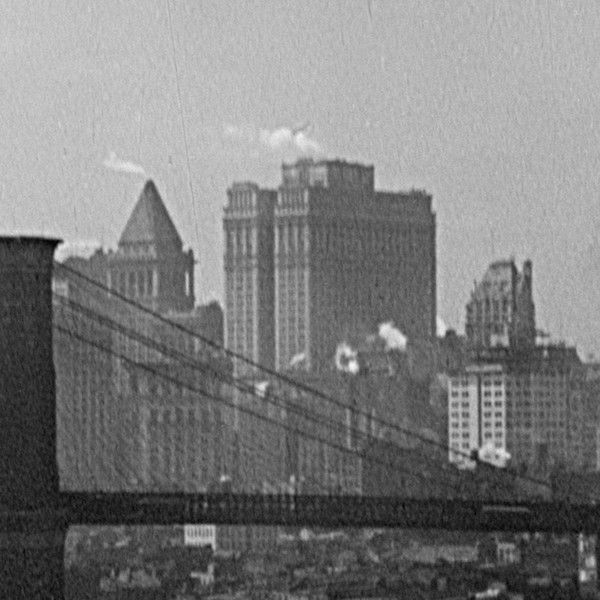 Morning reveals New York harbor, the wharves, the Brooklyn Bridge. A ferry boat docks, disgorging its huddled mass. People move briskly along Wall St. or stroll more languorously through a cemetery. Ranks of skyscrapers extrude columns of smoke and steam. In plain view. Or framed, as through a balustrade. A crane promotes the city's upward progress, as an ironworker balances on a high beam. A locomotive in a railway yard prepares to depart, while an arriving ocean liner jostles with attentive tugboats. Fading sunlight is reflected in the waters of the harbor. The imagery is interspersed with quotations from Walt Whitman, who is left unnamed.